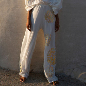 The most unique trousers you will ever own.Our hand-painted patterns are inspired by Greek architecture and crafted by expert seamstresses. We've adorned them with embroidery or prints by skillful artisans, for a look that cannot be replicated. These trousers are...
