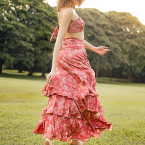 Add a pop of colour to your wardrobe with this bold and bright tangerine print set. Featuring an adjustable shoulder straps and front tie closure, the top is perfectly paired with the ruffled layers of the high-rise A-line skirt. Together...